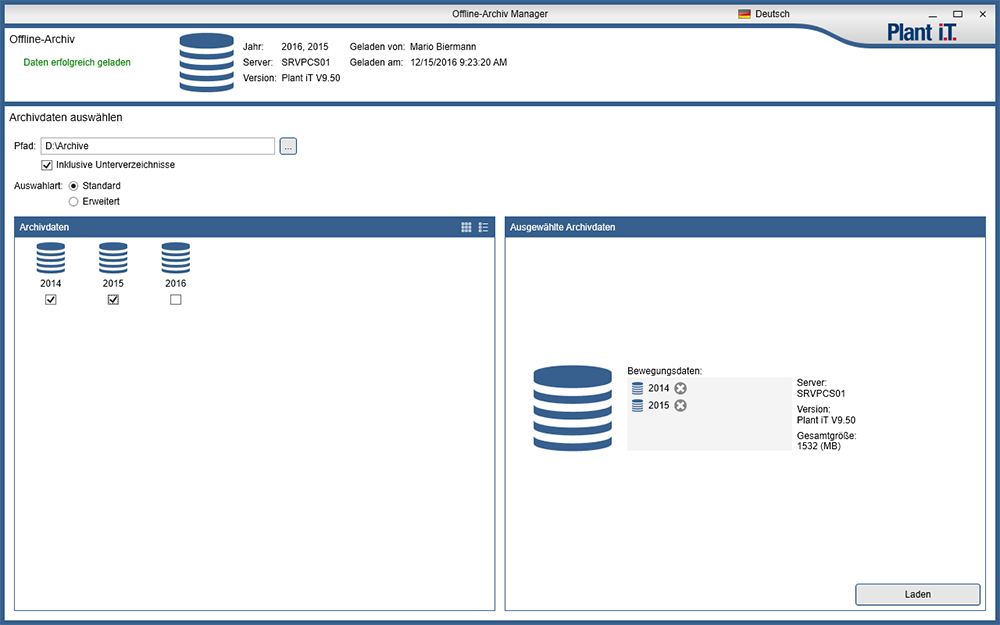 Die nutzerfreundliche Gestaltung des Plant iT archive managers erlaubt eine intuitive Bedienung des Moduls und den schnellen Zugriff auf die gewünschten Daten im Archiv. Darüber hinaus kommt das schlanke Software-Design ganz ohne zusätzliche Treiber, Applikationen oder andere Erweiterungen aus.